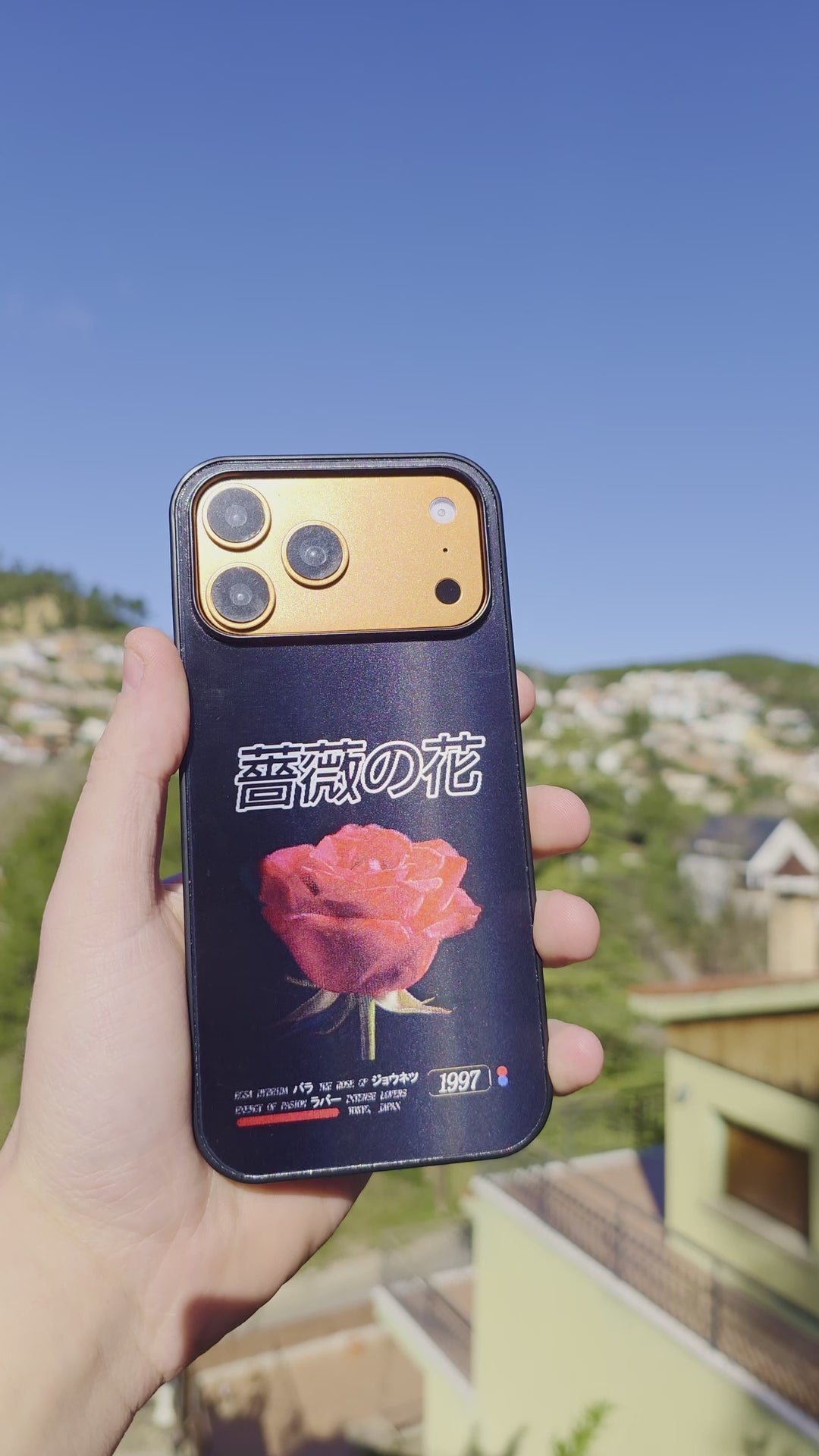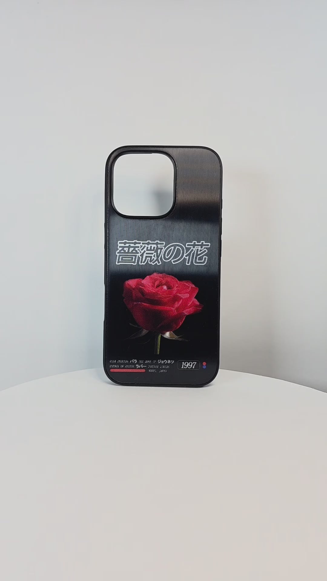 La composición evoca la estética romántica japonesa de los años 90, con una rosa central que domina el espacio con equilibrio y fuerza.